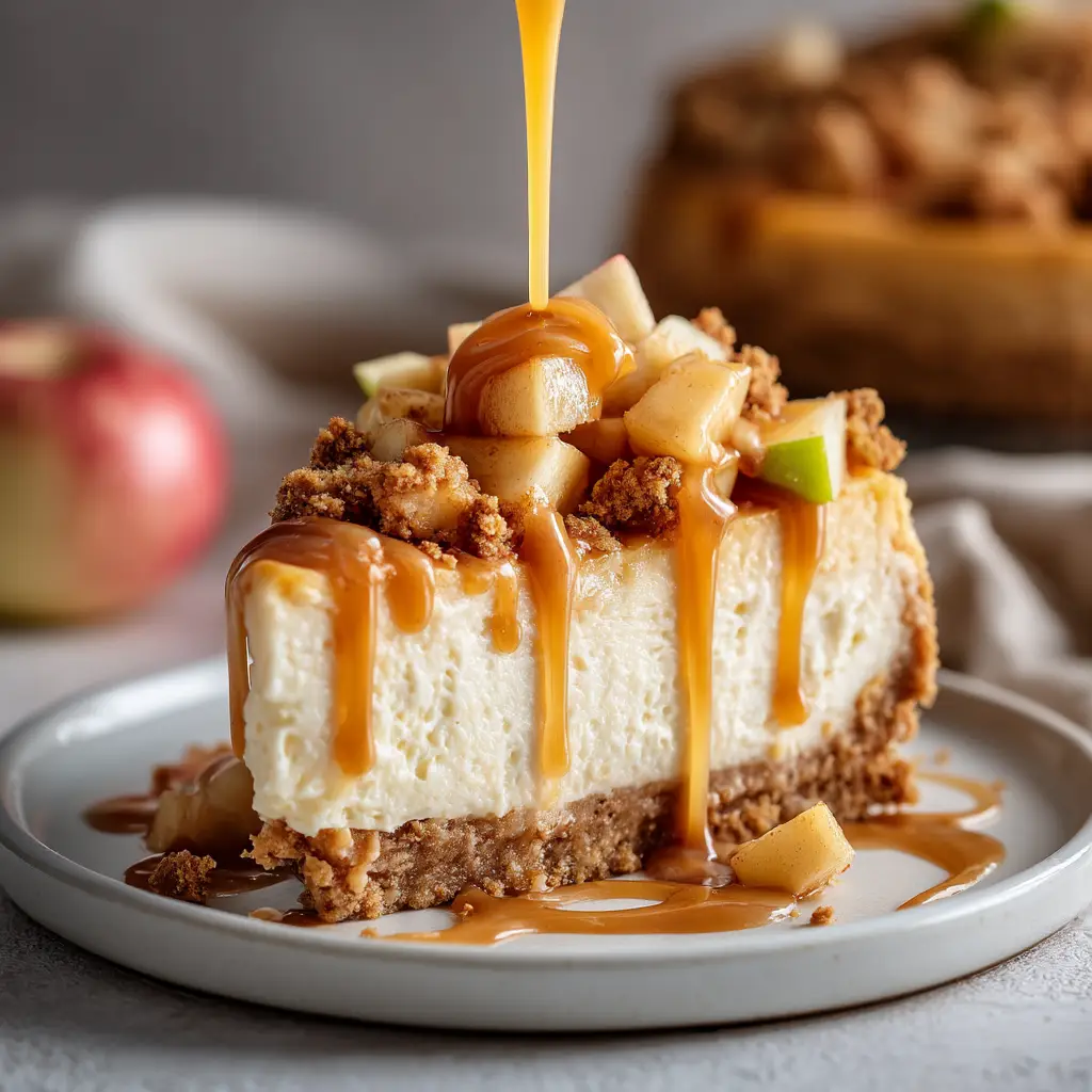 Once your cheesecake is fully chilled, it’s time to assemble. Gently spread the cooled apple topping evenly over the surface of the cheesecake. Just before serving, drizzle generously with the homemade caramel sauce. For a beautiful presentation, you can add a sprinkle of sea salt or chopped pecans over the top.