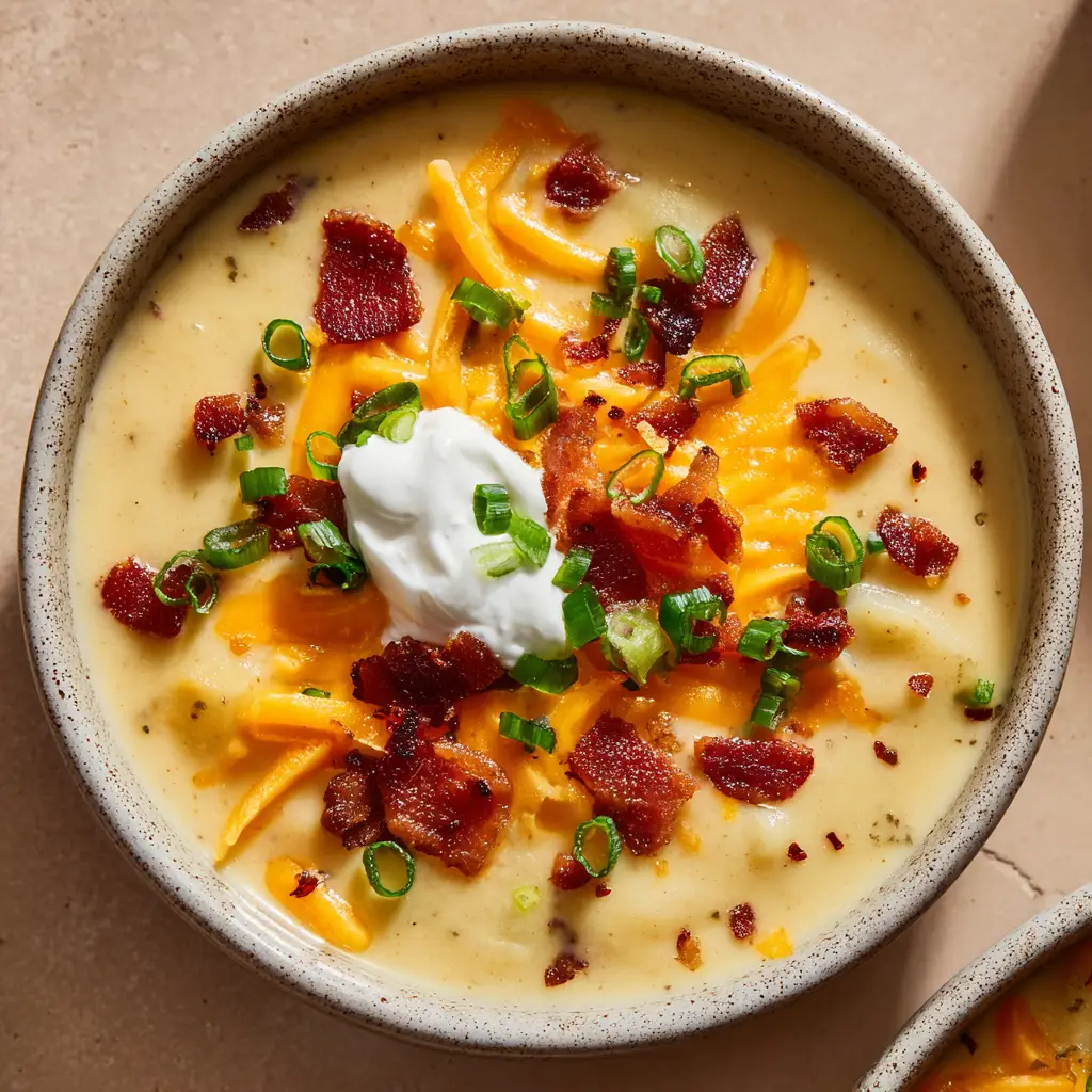 - Ladle the hot soup into bowls. Top generously with shredded cheddar cheese, crispy bacon crumbles, chopped green onions, and a dollop of sour cream. Serve immediately.