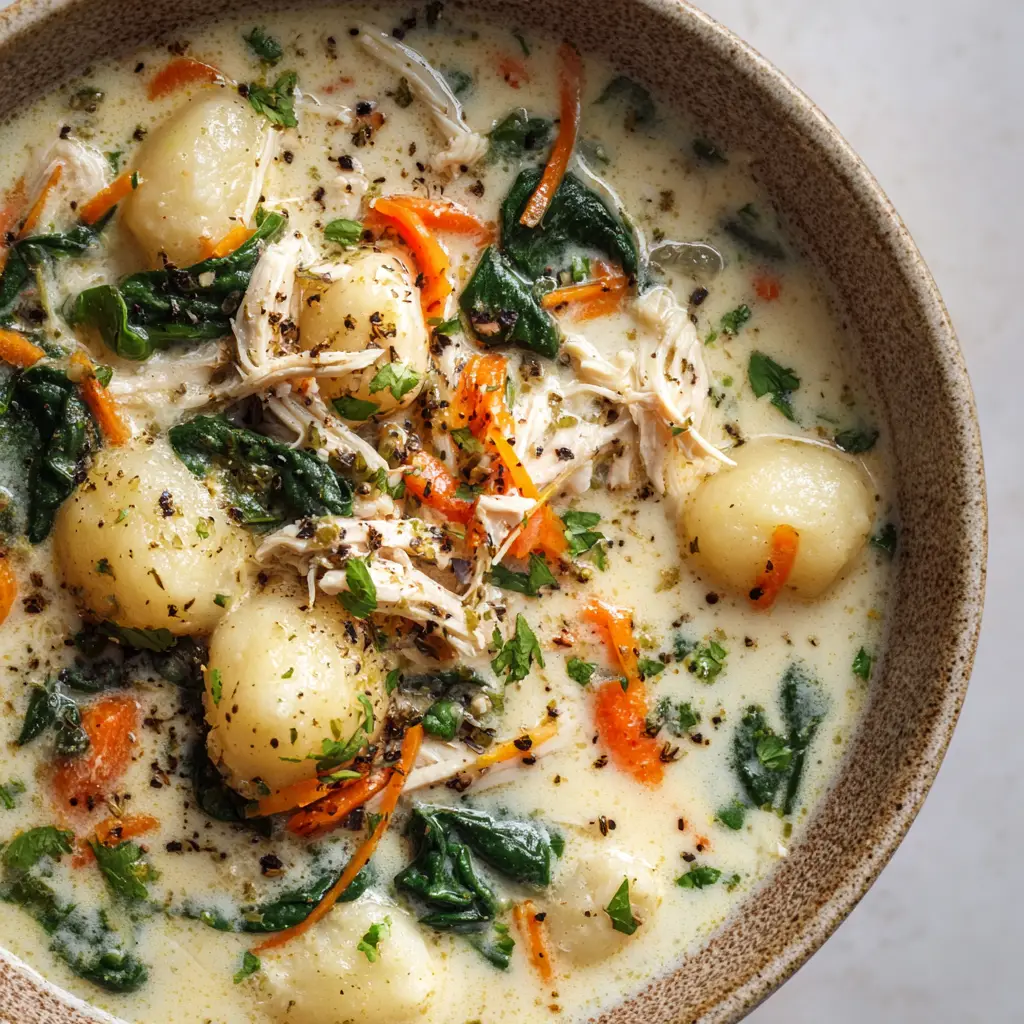 Drawing inspiration from classic Italian-American comfort foods, this recipe relies on a slow, gentle braise to create tender chunks of shredded cooked chicken breast. The magic happens right at the end when soft pillow-like potato gnocchi and wilted dark green spinach leaves are suspended in a thick, rich, opaque cream-based broth. It is visually stunning and tastes even better than it looks.