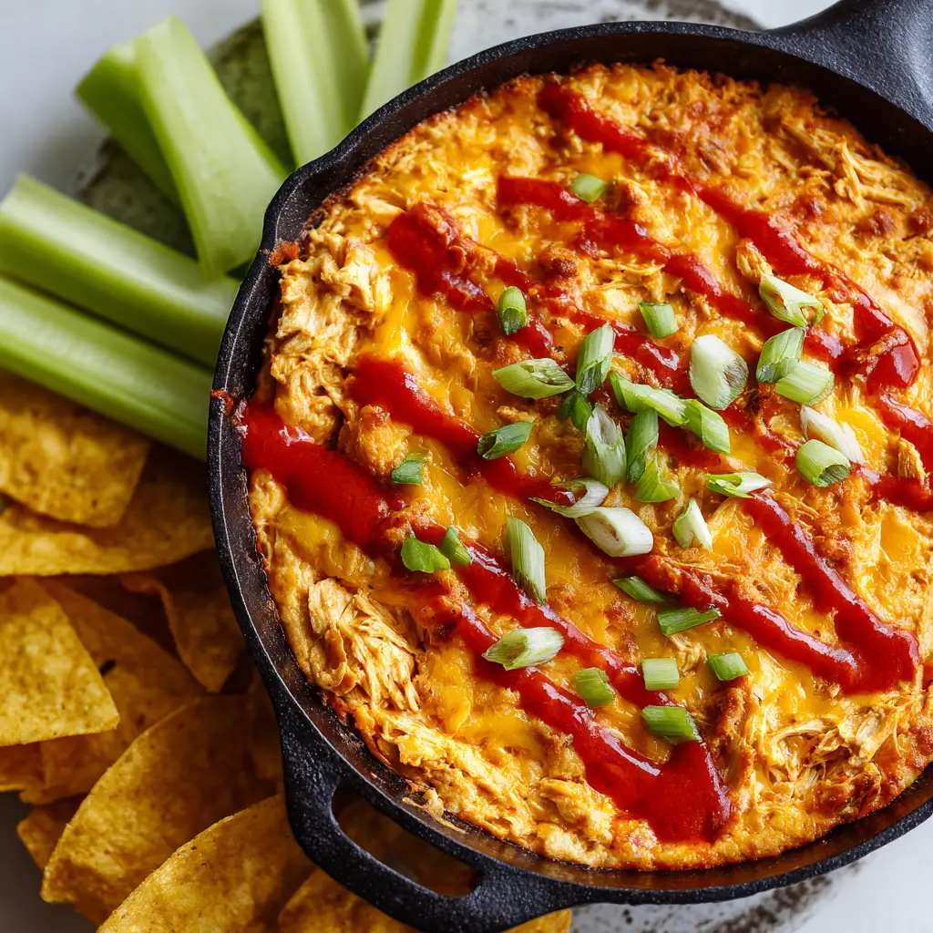 5. Remove from the oven and let rest for 5 minutes. Drizzle with smooth streaks of the reserved bright red buffalo sauce and scatter freshly chopped crisp green onions on top. Serve immediately with fresh celery sticks and yellow corn tortilla chips.
