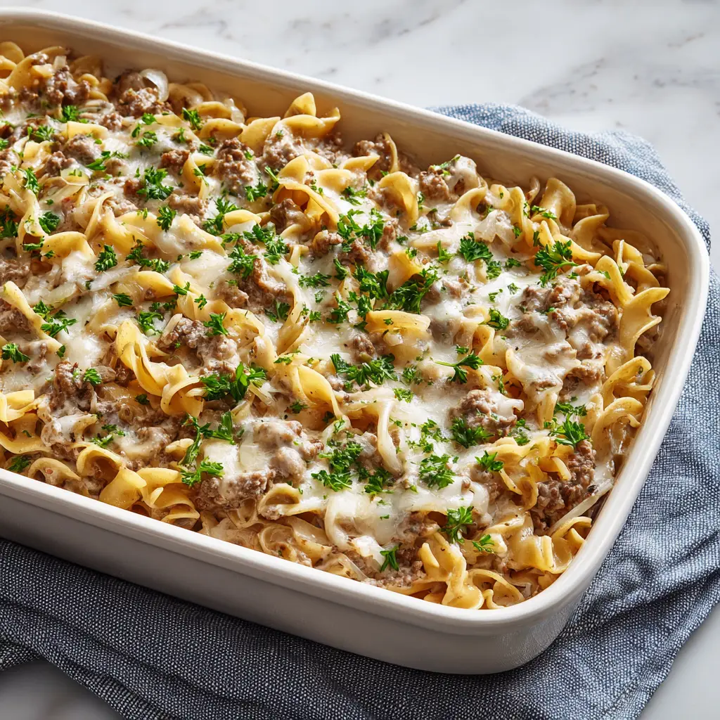 When you pull this dish from the oven, the visual appeal is undeniably mouthwatering. You will see a foundation of wide, curly egg noodles thoroughly mixed with cooked ground beef crumbles and tender, sliced white onions. The entire mixture is beautifully coated in a thick, rich, creamy off-white sauce that clings to every noodle and piece of beef.