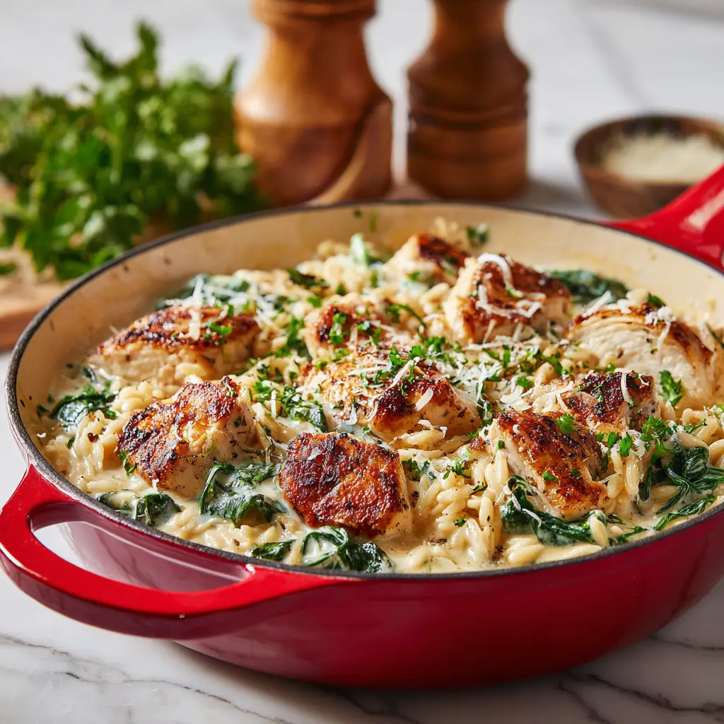 This High Protein Chicken Orzo is a one-pan wonder! Tender chicken and orzo pasta are tossed in a lusciously creamy, protein-packed sauce made without heavy cream. It's the perfect easy and healthy weeknight dinner, ready in 30 minutes.