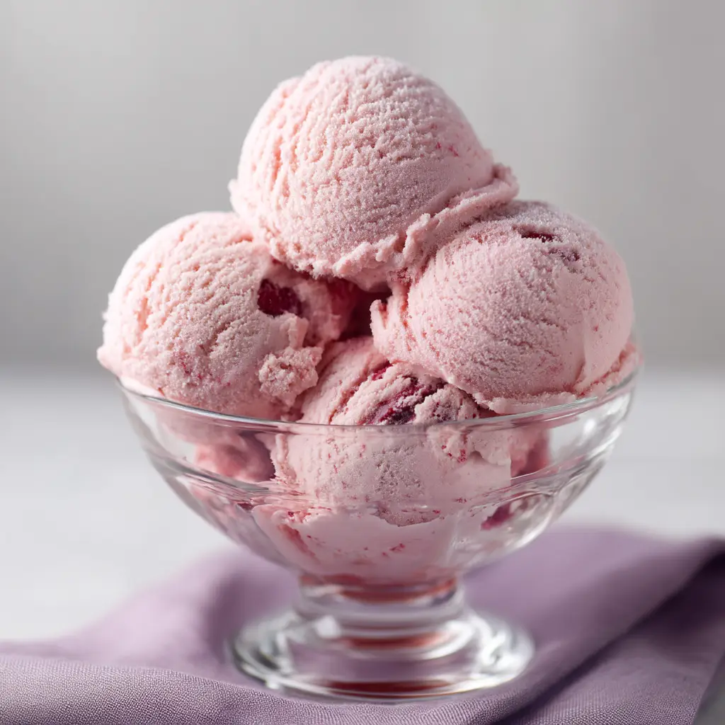 Several scoops of light pink strawberry high-protein ice cream made from cottage cheese, shown in a glass dish. This illustrates a delicious and healthy frozen dessert.