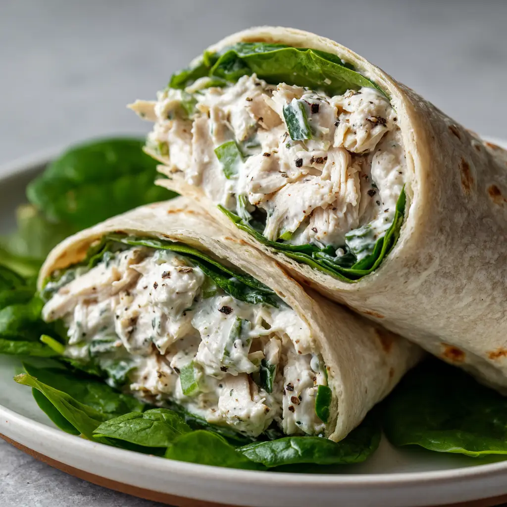 Always thoroughly dry your raw fresh baby spinach leaves before assembly. Creating a thick, dense layer of spinach acts as a protective barrier, preventing the moisture from the creamy chicken salad from seeping into the tortilla.