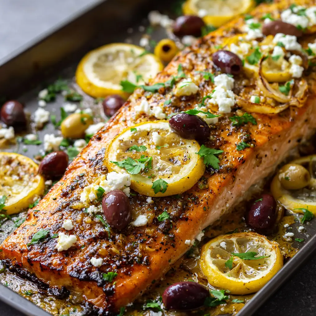 This Sheet Pan Salmon is more than just a quick weeknight dinner; it is a visually stunning, forensically balanced culinary experience. The contrast of the slightly charred crust against the glistening golden garlic butter sauce will have your family begging for this recipe every single week. The caramelized lemon slices and rustic feta crumbles provide an aesthetic appeal that looks like it came straight from a gourmet magazine.