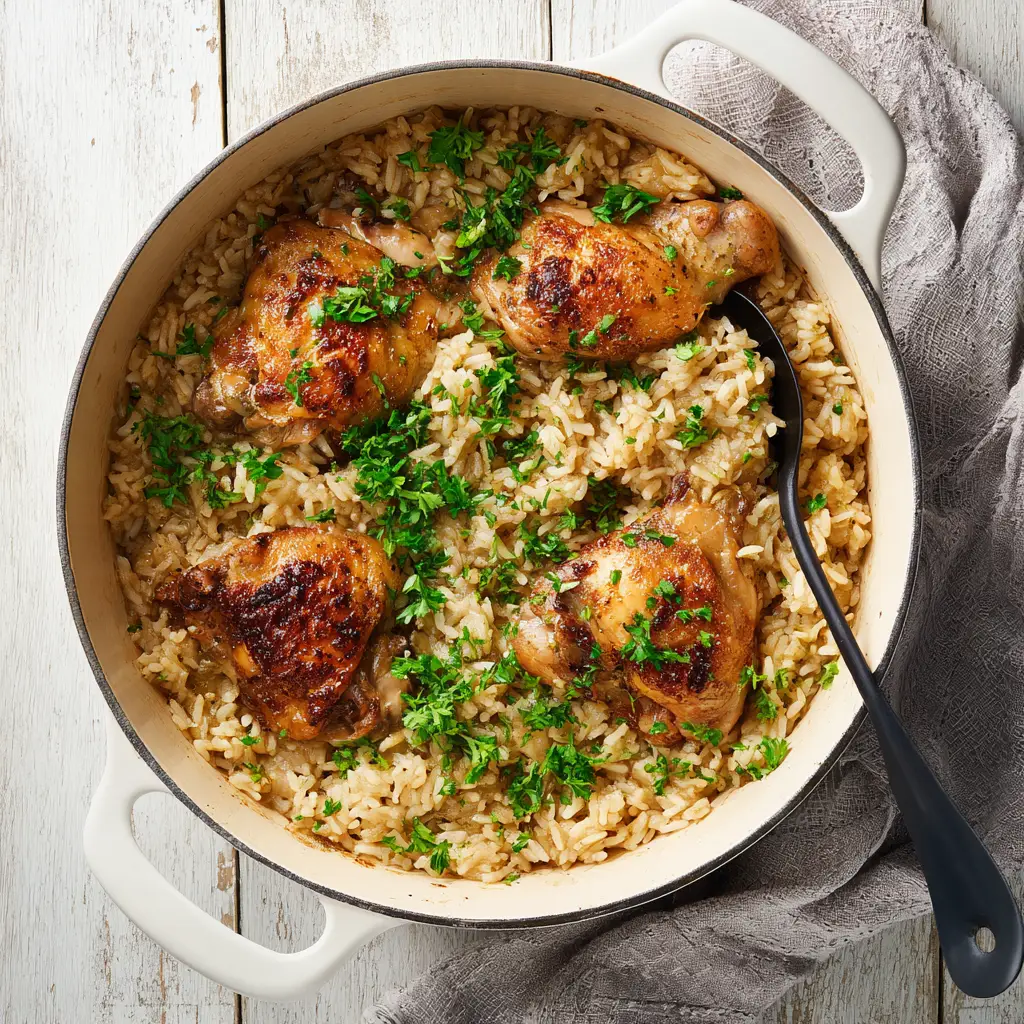 Imagine a white enamel cast-iron dutch oven sitting proudly on your rustic wood kitchen table, radiating heat and incredible aromas. Inside rests a bed of fluffy, gently simmered long-grain rice, acting as a pillowy cushion for perfectly browned, crispy-skinned chicken thighs. Finished with a bright scatter of freshly chopped parsley, it is a visual and sensory masterpiece that looks exactly like it belongs in a magazine.